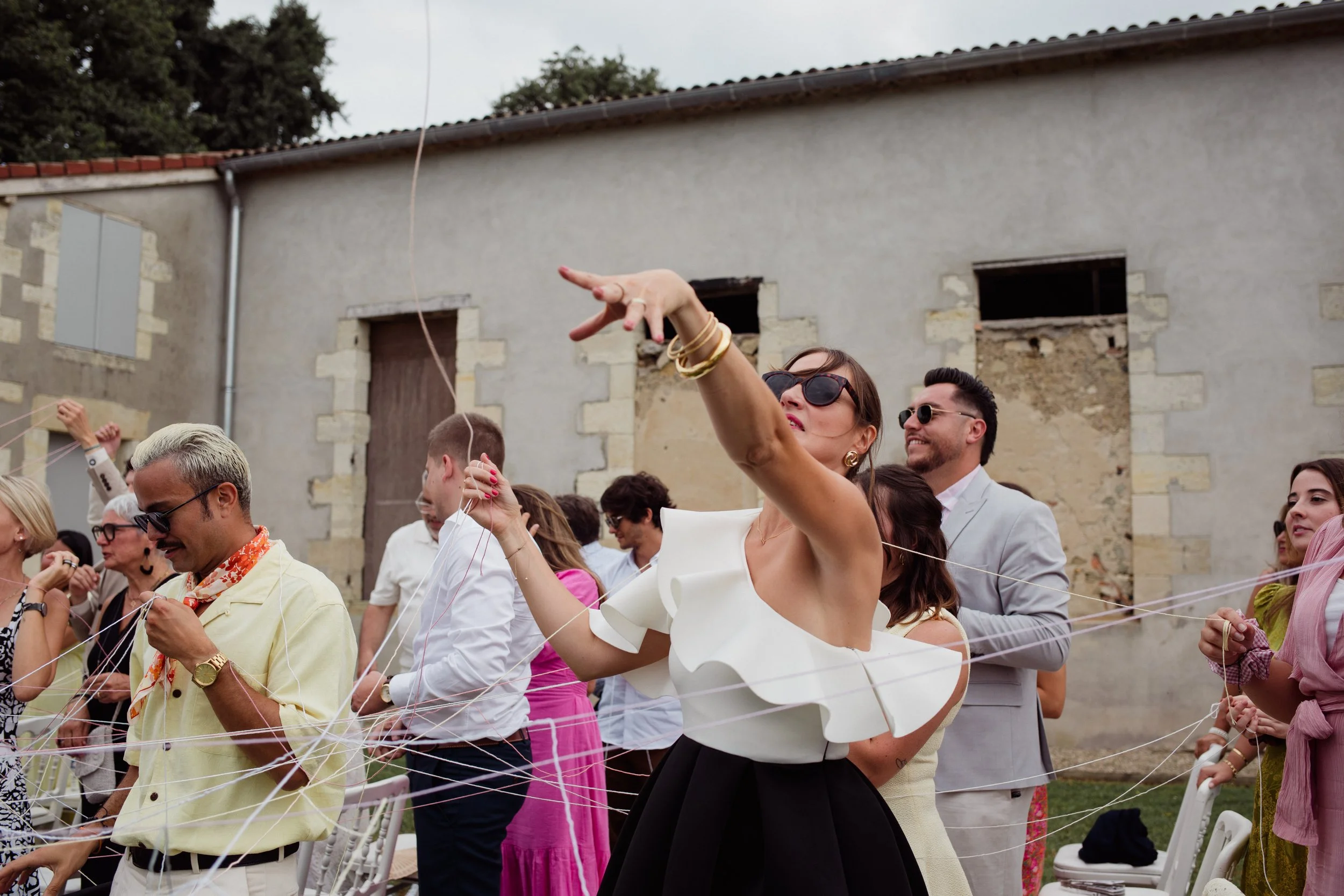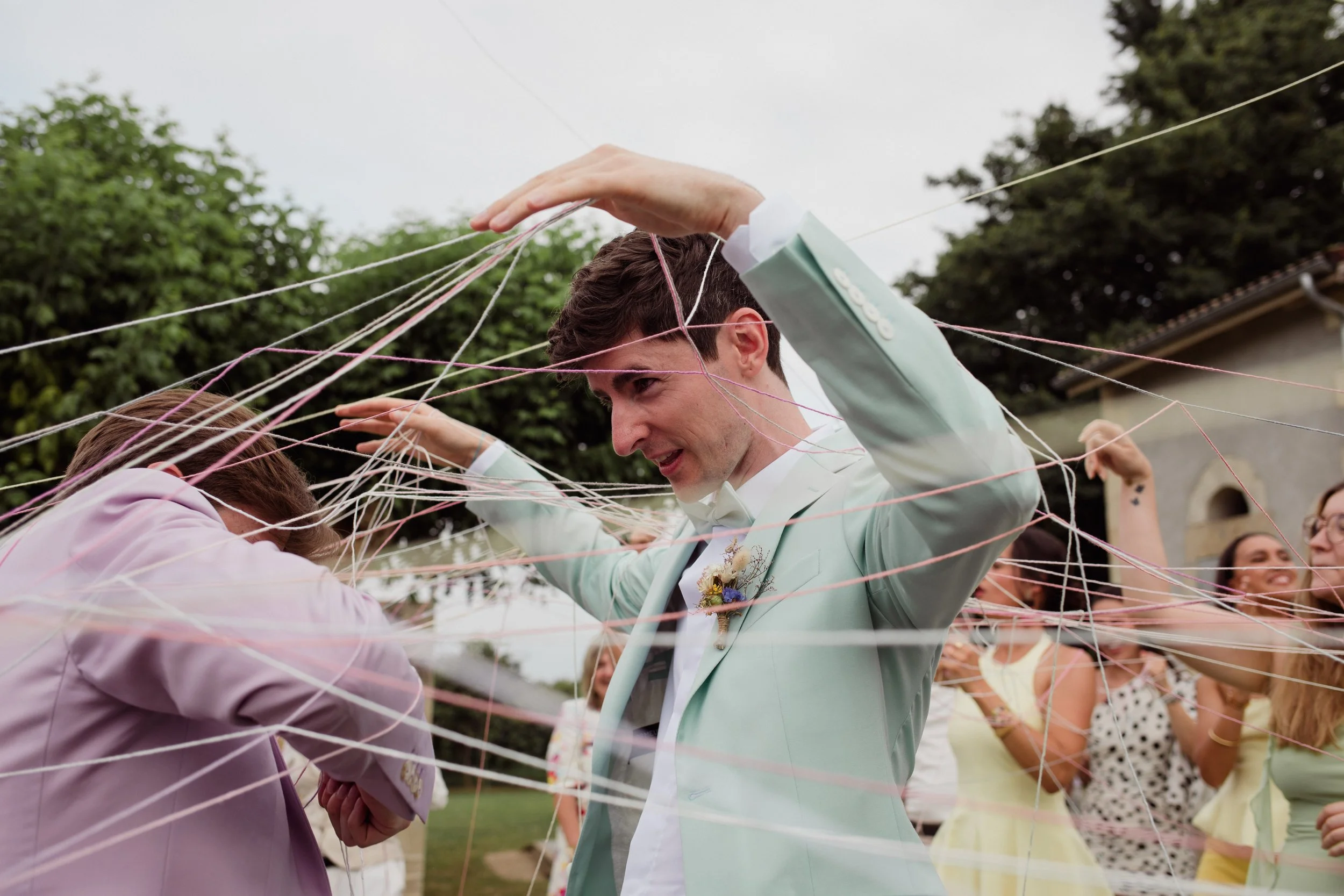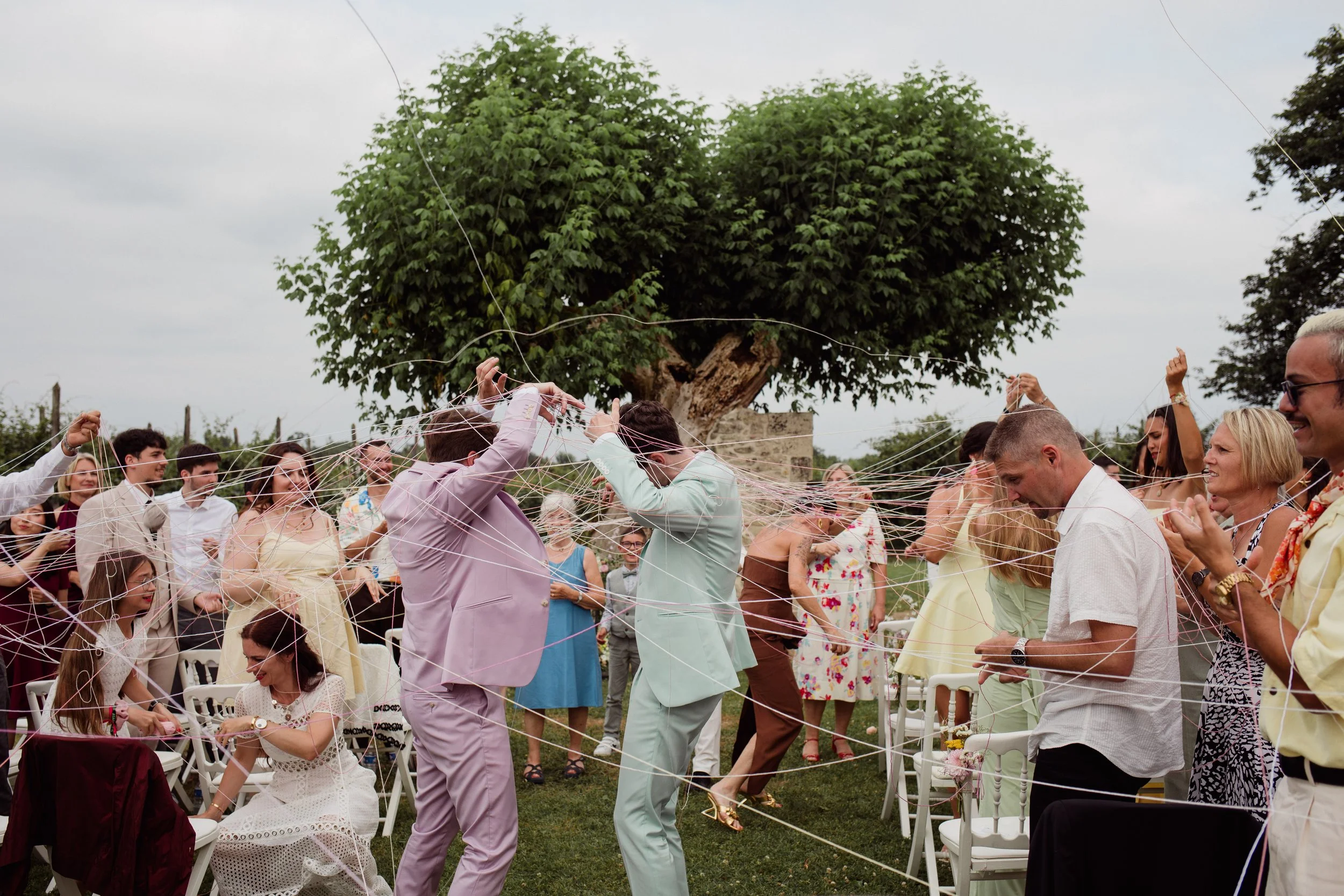 La cérémonie laïque était orchestré par la soeur et le frére des mariés.. et quel duo ! Ils ont mené la danse pendant une heure, alternant les rires et les larmes d’émotions (oui, moi aussi, j’étais tout aussi émue que la plupart des invités!), en invitant amis et famille à témoigner leur amour à Guillaume & Alexandre. Tout le monde s’est montrait vulnérable, parfois pudique dans les discours, mais ça n’en était que plus beau ! Avant l’échange des alliances : le rituel des pelotes de laine était magnifique ! En arrivant, le cortège des témoins avait distribué les fameuses pelotes en restant très mysterieux sur leur utilisation. Les mariés se sont alors placés au milieu de l’allée et les invités ont pu lancer les fils de laine de part et d’autre du couple, symbolisant les liens entre tous les invités présent autour d’eux. Un moment joyeux sur une super musique, très beau à voir et graphiquement génial pour les images ! Après l’immense toile formé au dessus de la tête des mariés, les grands-parents ont pu amener les bagues fabriquées par les mariés eux-même lors d’un Atelier avec Aliénor : moment émouvant et suspendu qui a magnifiquement cloturé cette cérémonie de mariage !