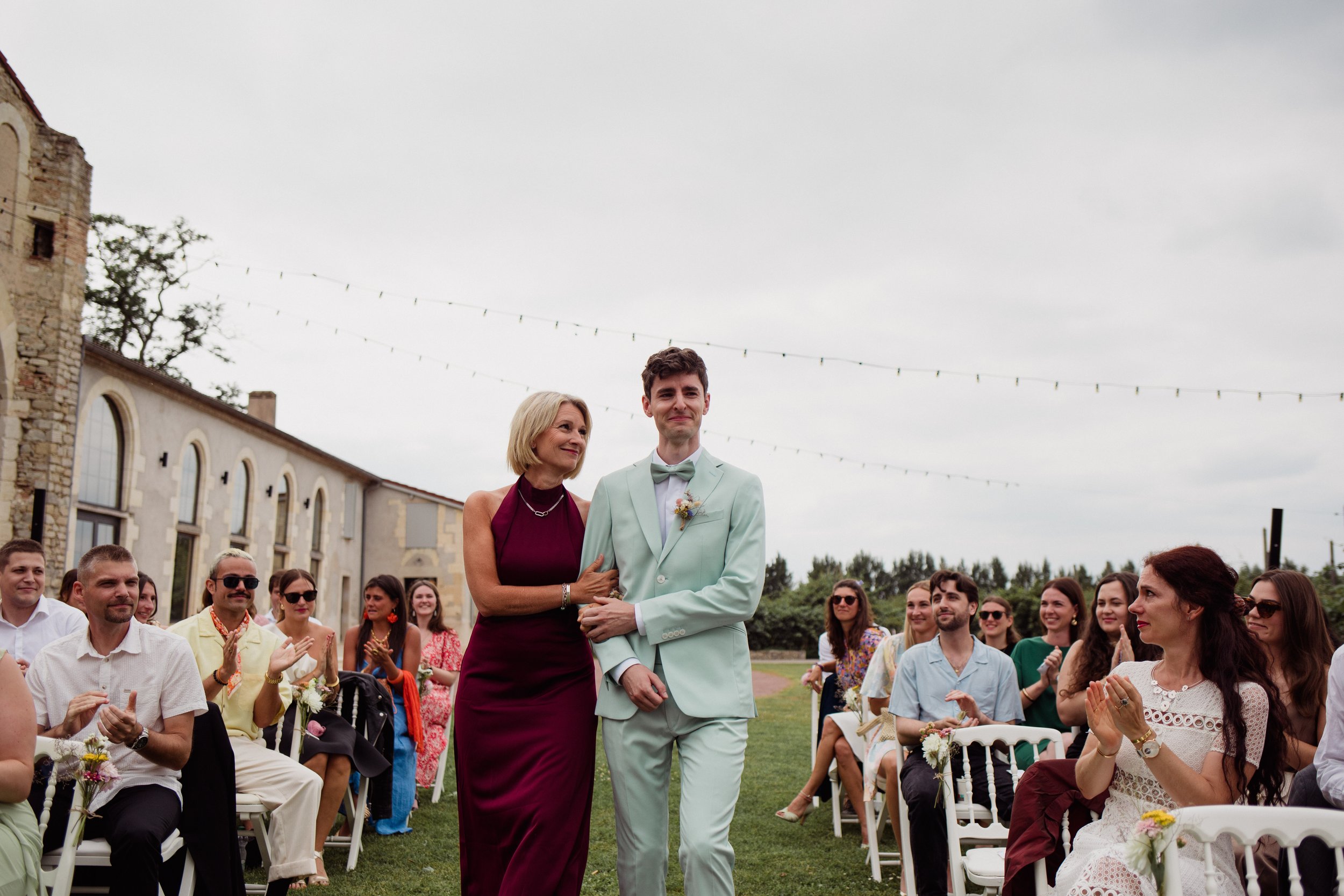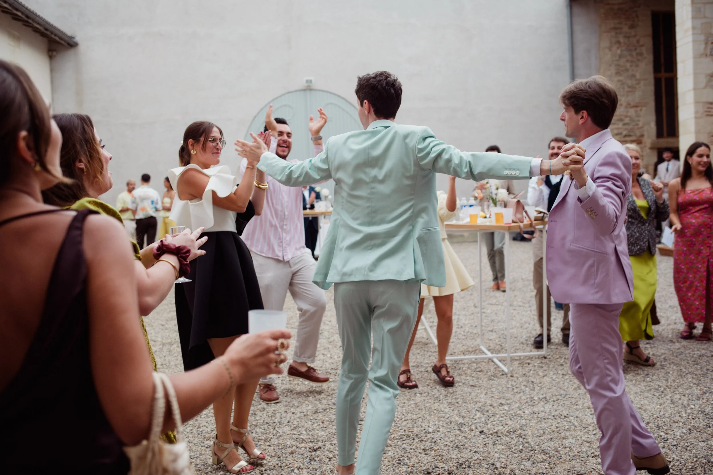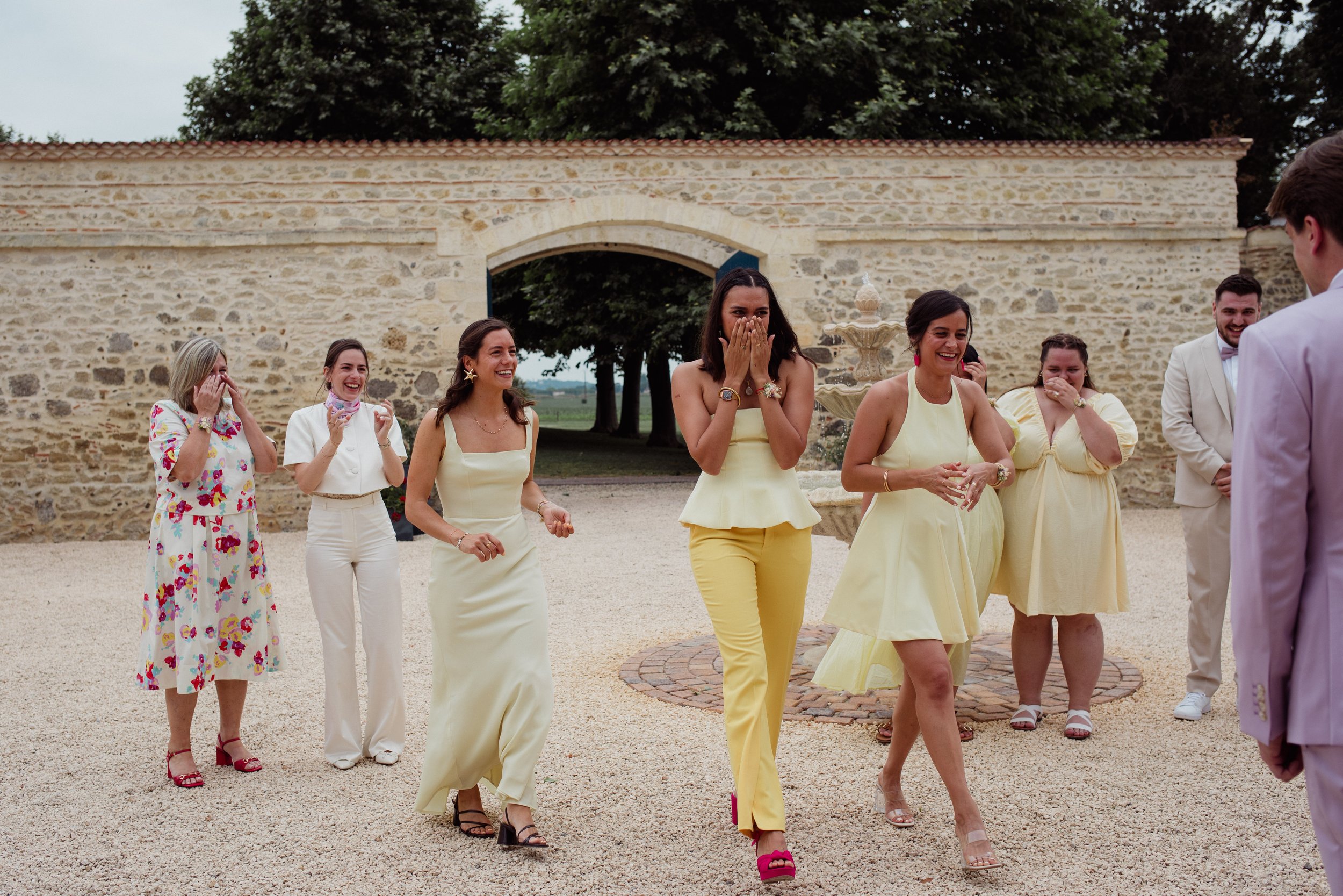 J’adore me replonger dans les différents reportages mariages de l’année passée et écrire vos histoires par ici, lorsque vous me donnez l’autorisation. Retour sur ces deux superbes journées de juin : je vous épargne la célébration à la mairie de Bordeaux, le vendredi en petit comité; je vous propose de vous téléporter directement le samedi en début d’après-midi, au chateau de Cantecort, tout proche de chez moi, en sud-gironde ! J’y retrouve mes mariés, Guillaume & Alexandre, les deux vidéastes du jour : Marine & Adnan, et ma copine Christel qui s’occupe d’installer le décor floral de la cérémonie laïque. Après l’habillage, découverte des costumes par les témoins, parents et demoiselles d’honneur dans la cour du château. C’est déjà beaucoup d’émotions : tout le monde réalise que la journée commence ! Le temps est gris mais les robes jaunes des demoiselles d’honneurs viennent colorer les nuages bas. Les mariés ne connaissaient pas les costumes de l’un et de l’autre (ils ont été super bien accompagnés par Clémence de l’Atelier 5 Bordeaux !).. ils ont donc fait un “first look” à l’abri des regards, pendant que les invités arrivaient tranquillement à l’arrière du domaine. Les costumes et les boutonnières fleuries.. tout matchaient à la perfection ! C’était déjà si beau de les voir tous les deux.. mais je n’étais pas prête pour les vagues de larmes de joies qui allaient m’accompagner pendant quelques heures encore !