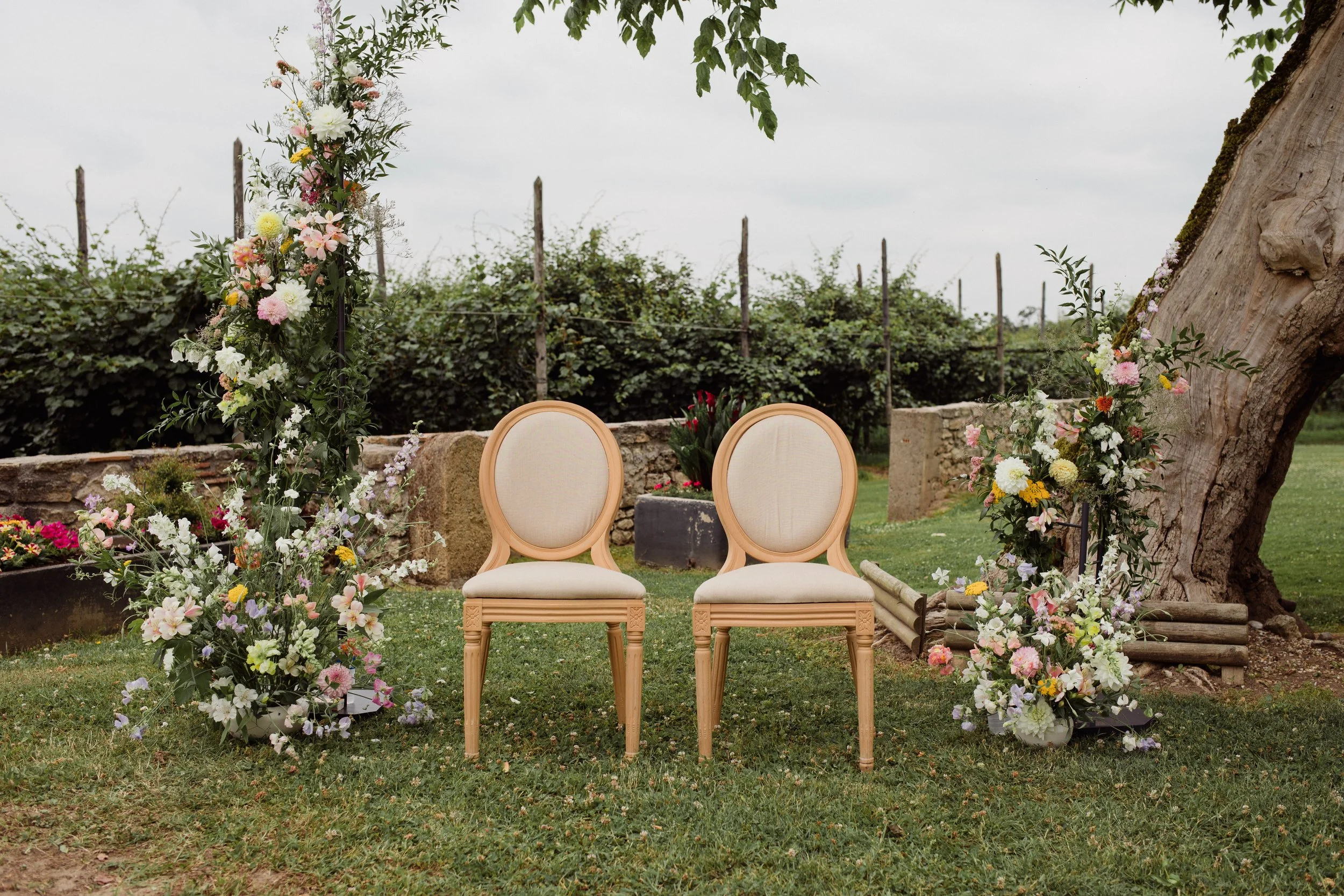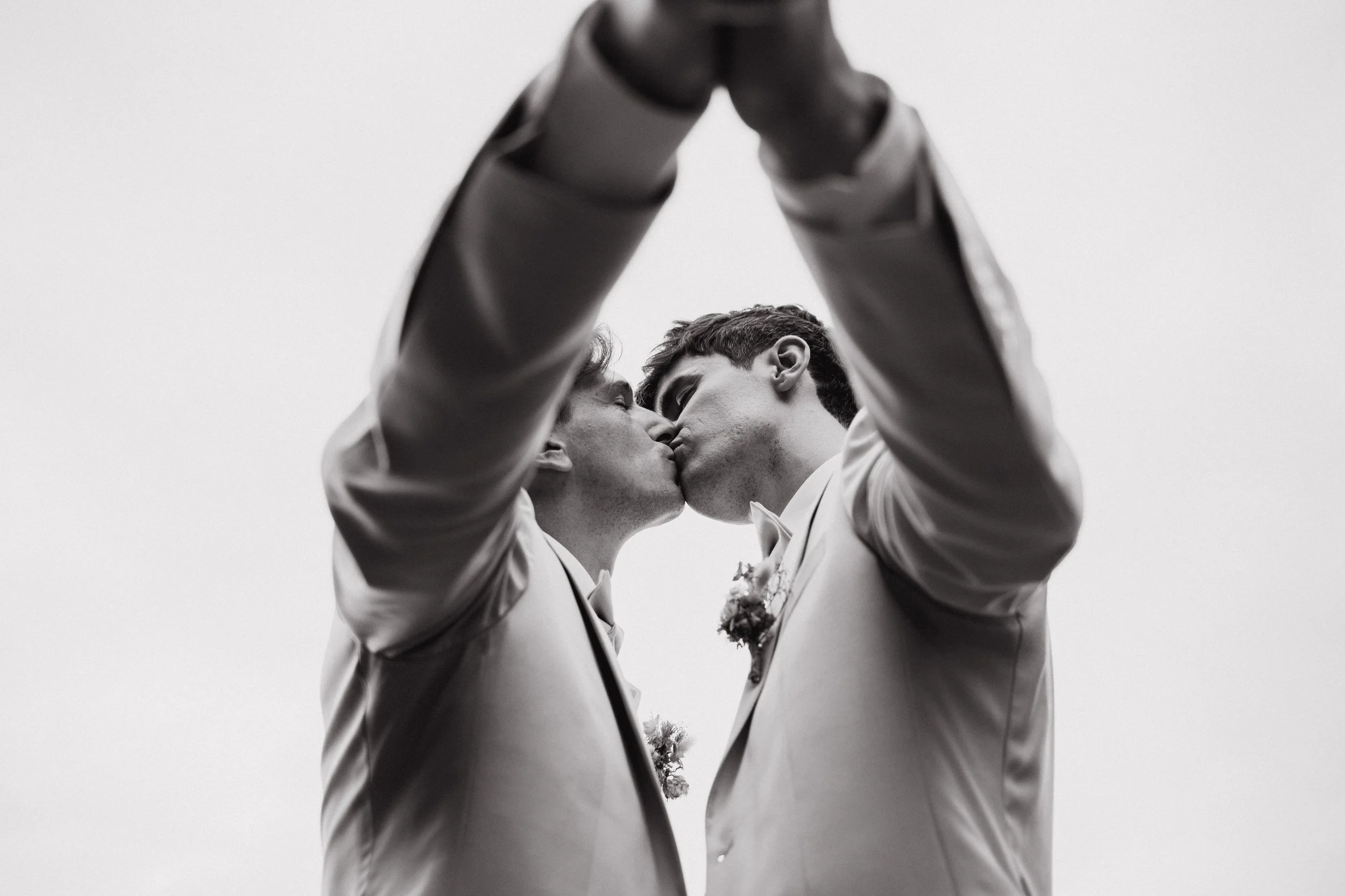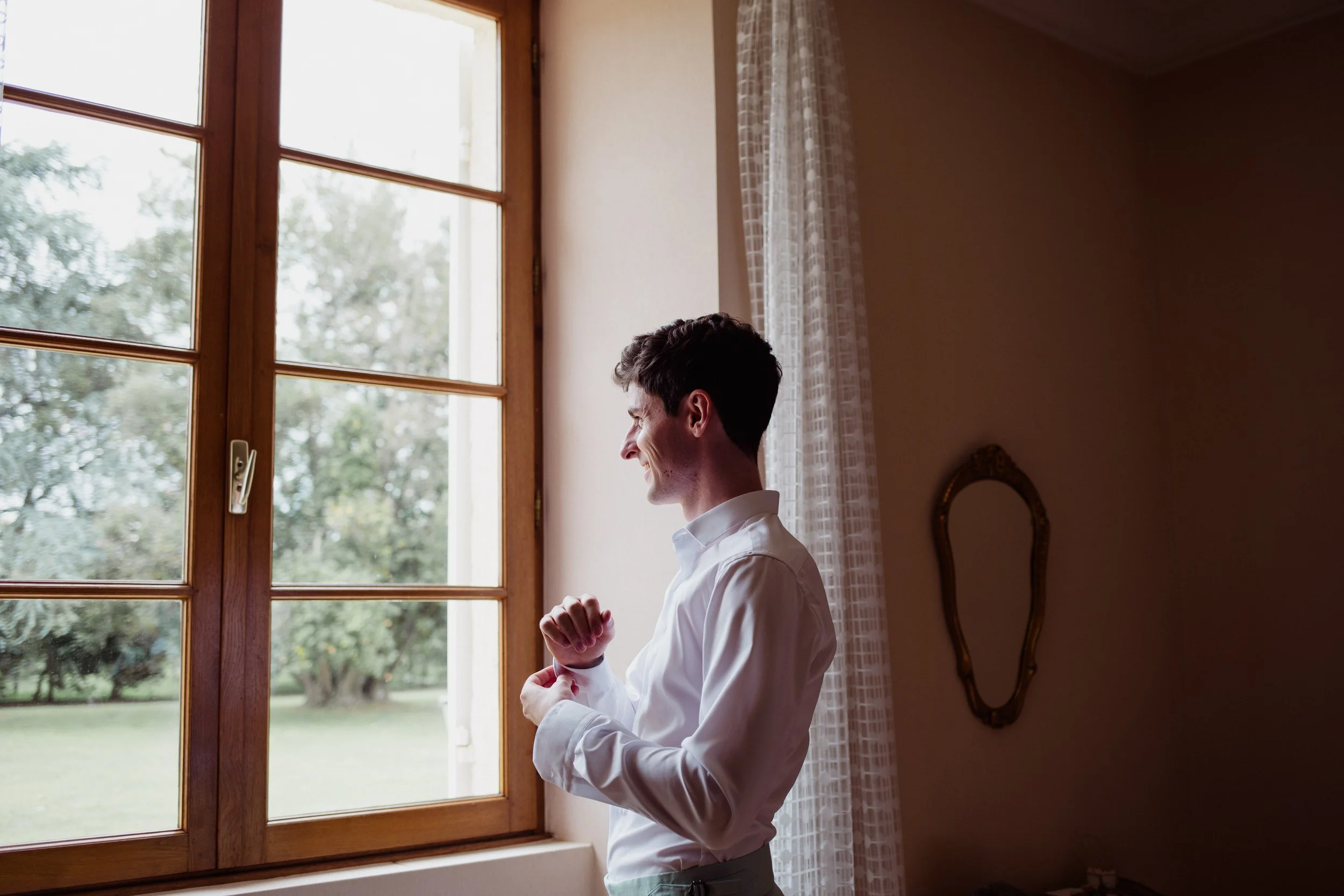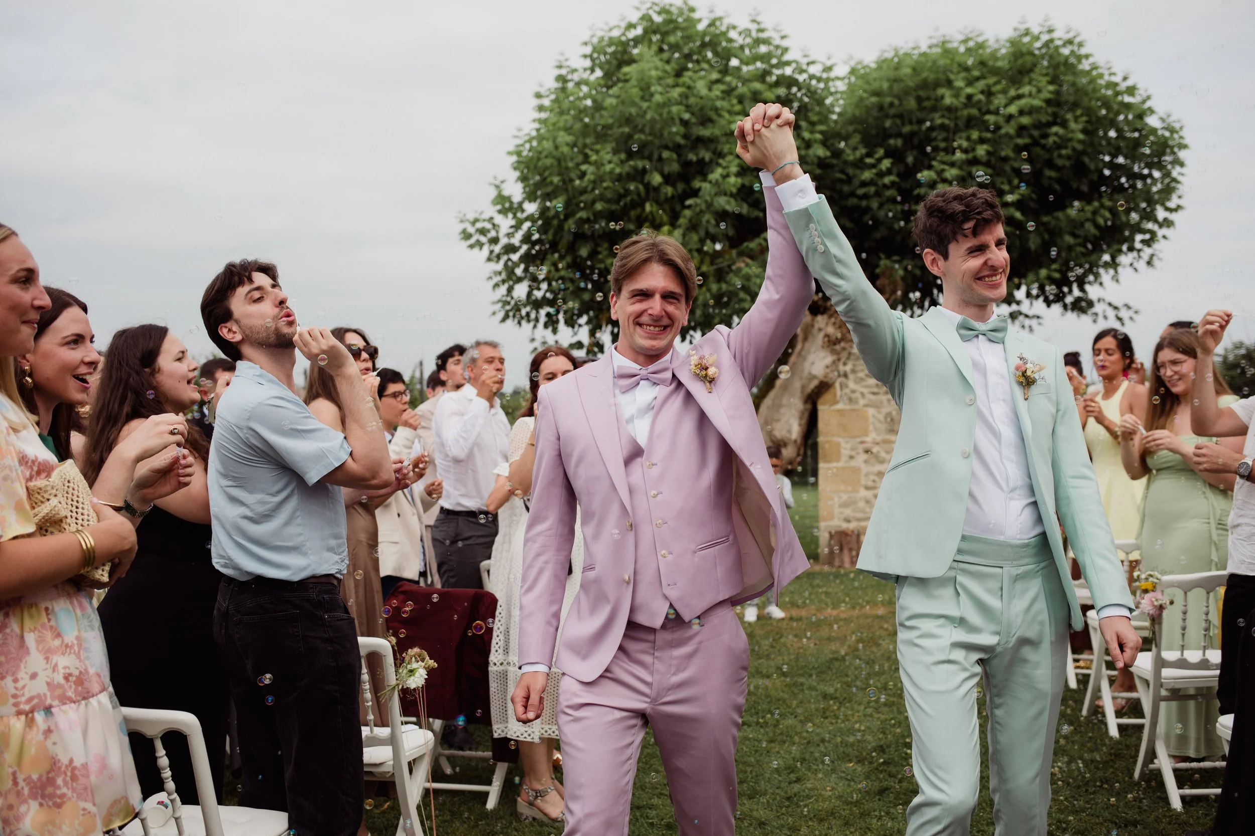 J’adore me replonger dans les différents reportages mariages de l’année passée et écrire vos histoires par ici, lorsque vous me donnez l’autorisation. Retour sur ces deux superbes journées de juin : je vous épargne la célébration à la mairie de Bordeaux, le vendredi en petit comité; je vous propose de vous téléporter directement le samedi en début d’après-midi, au chateau de Cantecort, tout proche de chez moi, en sud-gironde ! J’y retrouve mes mariés, Guillaume & Alexandre, les deux vidéastes du jour : Marine & Adnan, et ma copine Christel qui s’occupe d’installer le décor floral de la cérémonie laïque. Après l’habillage, découverte des costumes par les témoins, parents et demoiselles d’honneur dans la cour du château. C’est déjà beaucoup d’émotions : tout le monde réalise que la journée commence ! Le temps est gris mais les robes jaunes des demoiselles d’honneurs viennent colorer les nuages bas. Les mariés ne connaissaient pas les costumes de l’un et de l’autre (ils ont été super bien accompagnés par Clémence de l’Atelier 5 Bordeaux !).. ils ont donc fait un “first look” à l’abri des regards, pendant que les invités arrivaient tranquillement à l’arrière du domaine. Les costumes et les boutonnières fleuries.. tout matchaient à la perfection ! C’était déjà si beau de les voir tous les deux.. mais je n’étais pas prête pour les vagues de larmes de joies qui allaient m’accompagner pendant quelques heures encore !
