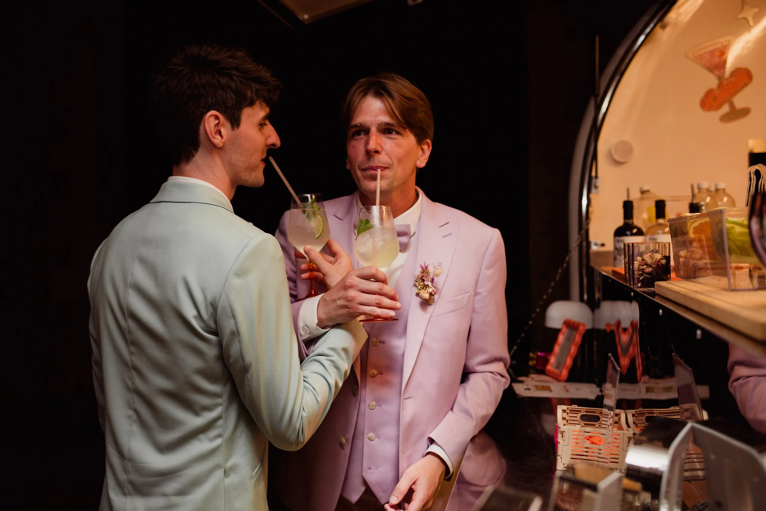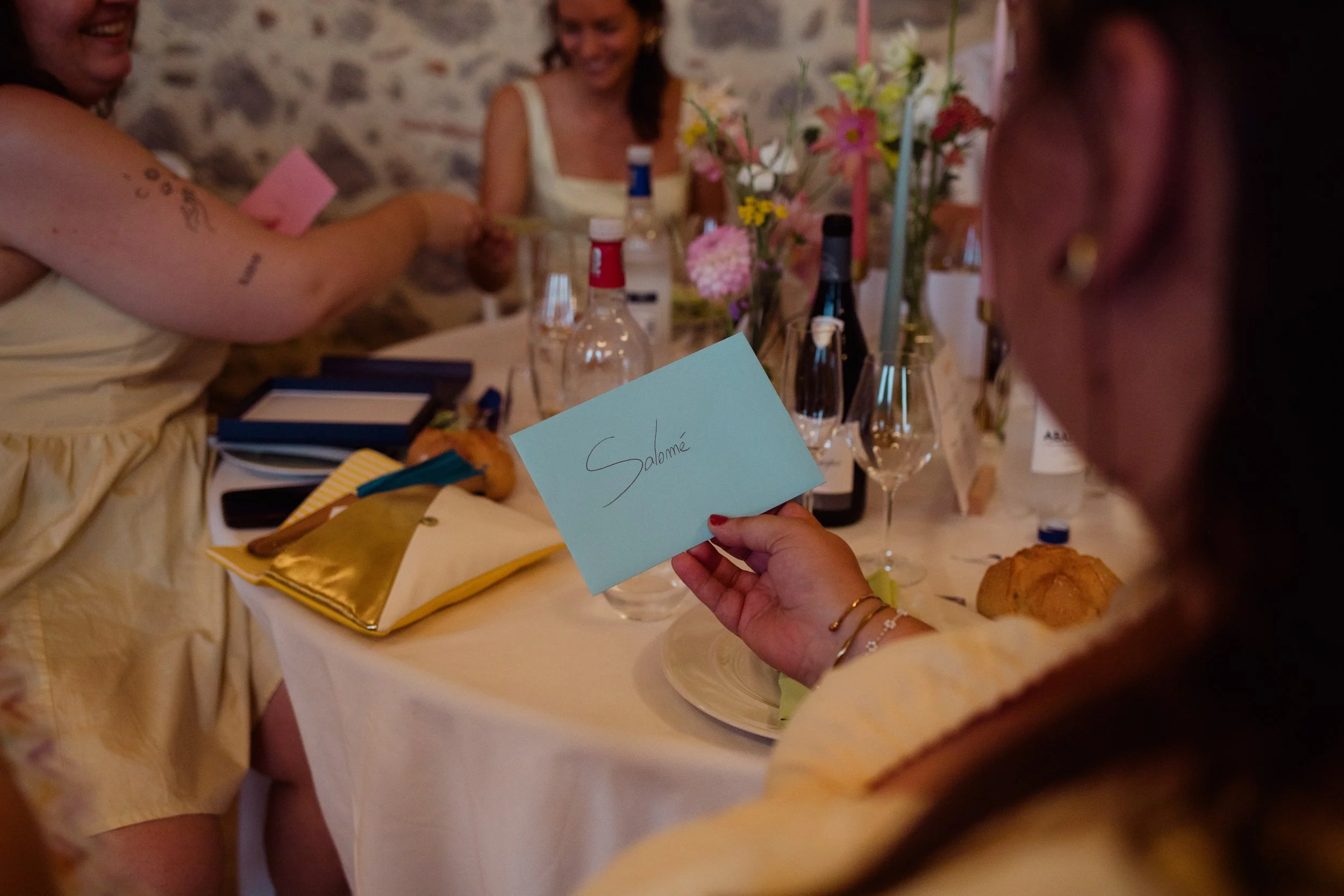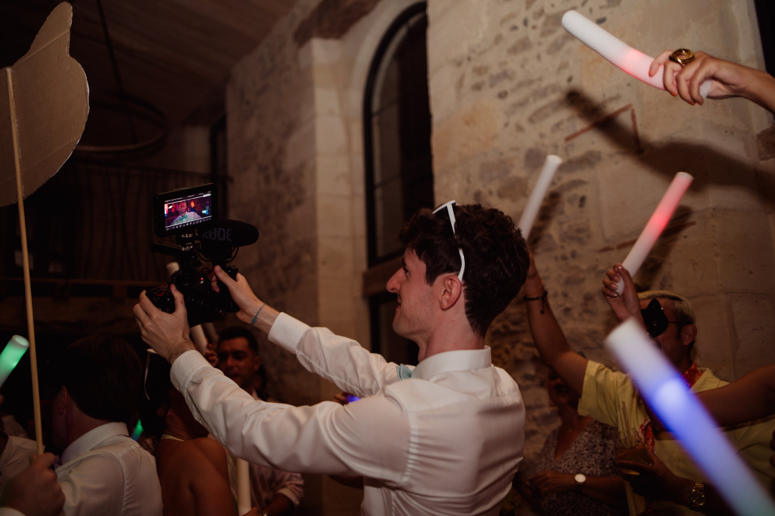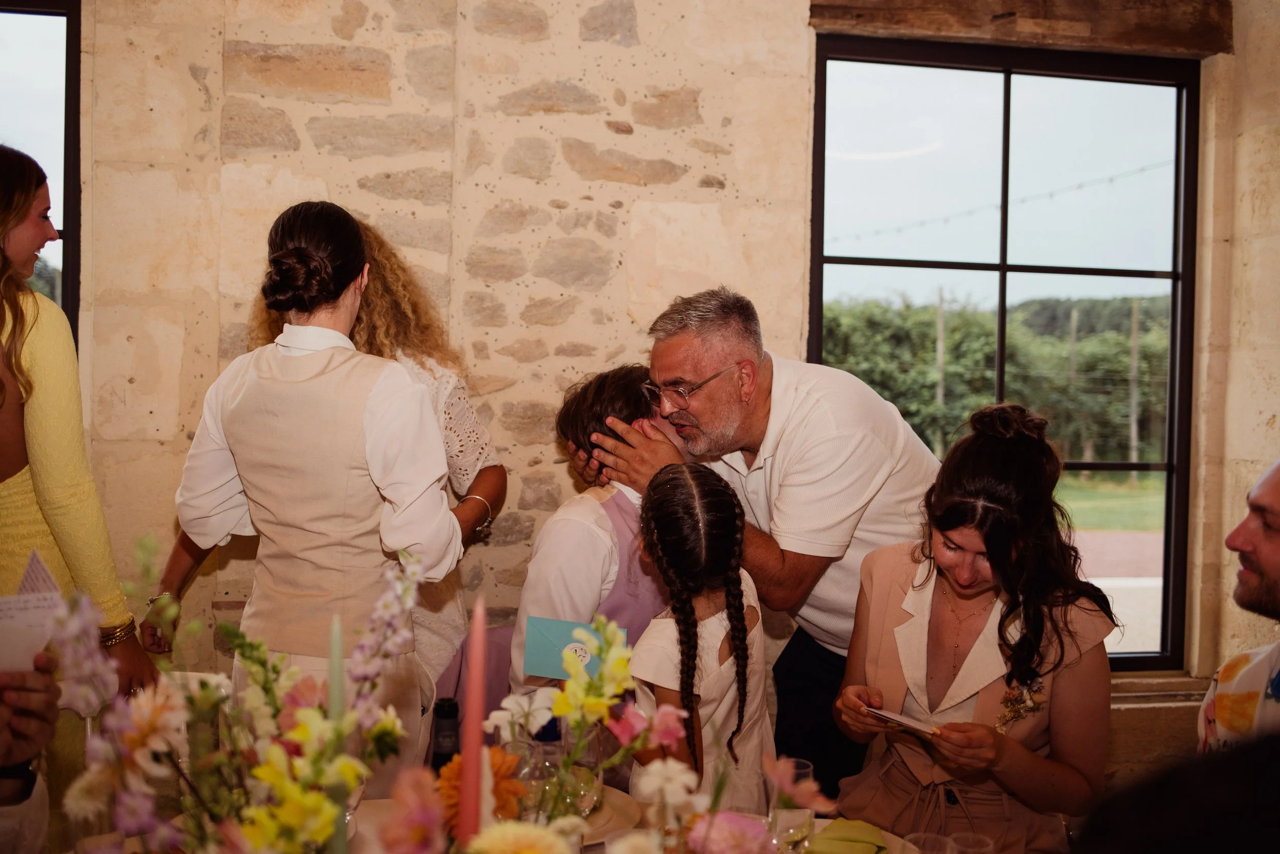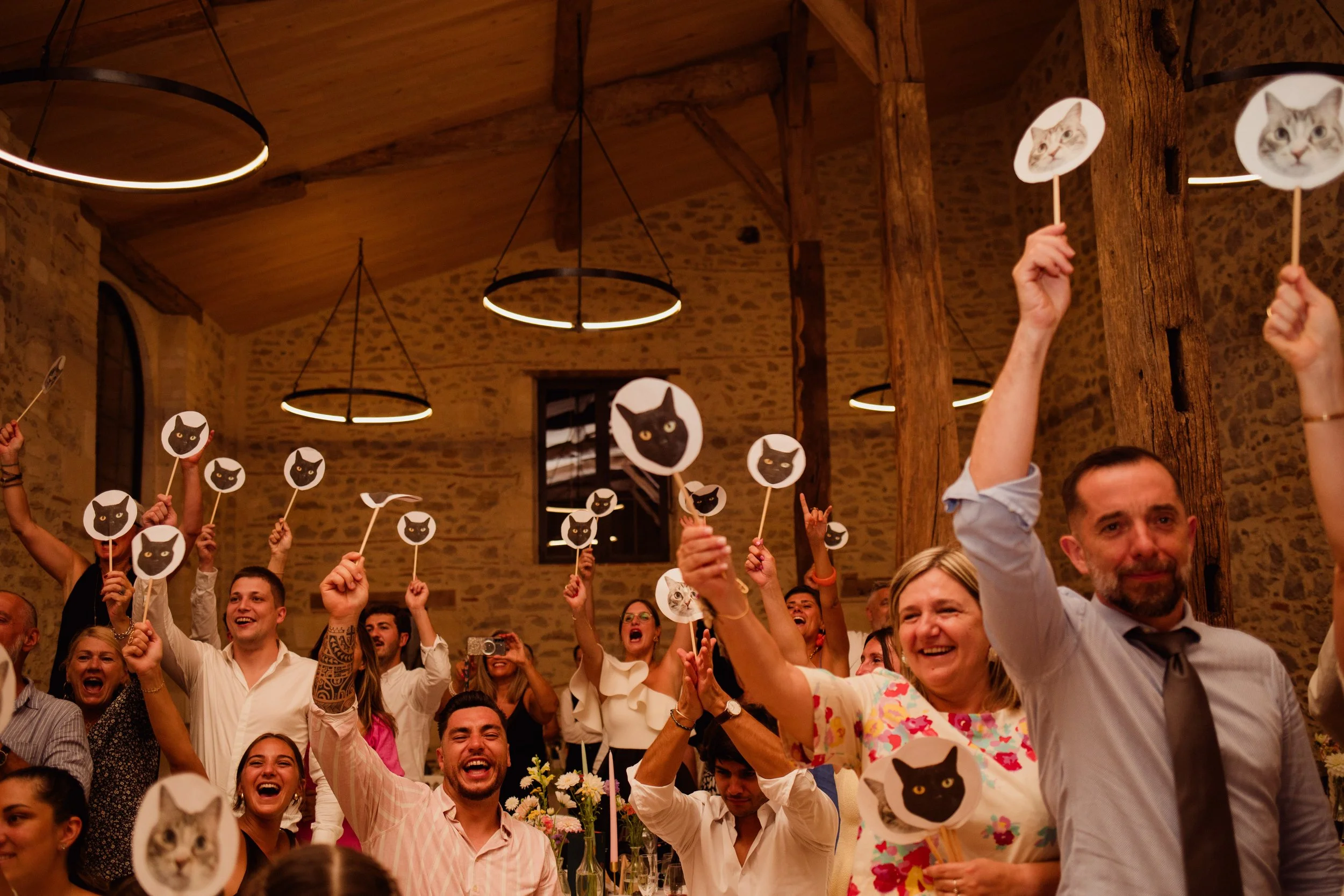 Je l’avais remarqué en photographiant la salle du dîner, mais effectivement pas de cadeaux d’invités sur les tables. En tout cas, pas de cadeaux matériels.. mais une attention toute particulière : les mariés avaient écrit une lettre pour chacun des 100 invités présents. Une attention personnalisée qui a tiré quelques larmes aux proches.. c’était beau à voir, tout cet amour partagé ! Quelques animations pendant le repas, mais surtout.. une battle des mariés qui se sont affronté avec toute leur team ! La famille et les amis de Guillaume & Alex ont pu voter pour leur danse préférée grâce à des pancartes chats ! (les chats des mariés, pardi !) C’était si fun & drôle ! Avant de repartir dans les larmes pour la présentation du dessert du mariage réalisé par le papa d’Alexandre, pâtissier : les montagnes russes d’émotions, je vous l’avait dit ! L’orage grondait dehors, mais surprise! Une petite caravane de cocktails s’est installé sous le porche du château : c’est M la Boum qui lance la soirée : une danse avec les mamans et une première danse entre nos amoureux du jour. J’ai eu du mal à slalommer sur le dancefloor tellement il était bondé ! L’ambiance était à son paroxysme lorsque j’ai quitté Guillaume & Alex, et je suis sûre qu’elle a duré jusqu’au petit matin !